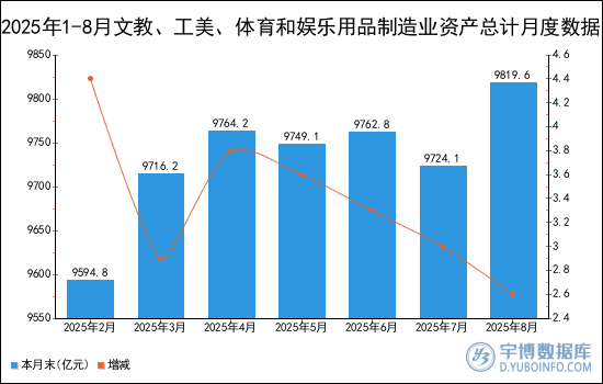 2025年8月文教、工美、體育和娛樂用品制造業(yè)資產(chǎn)總計本月末為9819.6億元,增減2.6%。