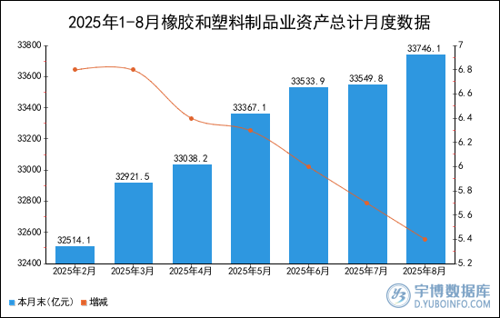 2025年8月橡膠和塑料制品業(yè)資產(chǎn)總計(jì)本月末為33746.1億元,增減5.4%。