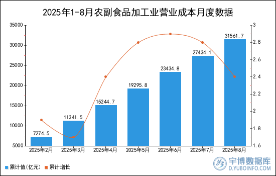 2025年1-8月農(nóng)副食品加工業(yè)營(yíng)業(yè)成本累計(jì)值為31561.7億元,累計(jì)增長(zhǎng)2.4%。