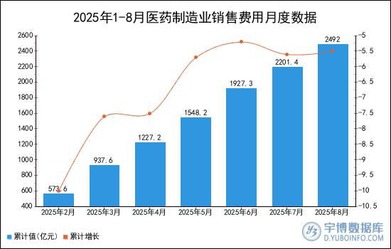 2025年1-8月醫(yī)藥制造業(yè)銷售費(fèi)用累計(jì)值為2492億元。