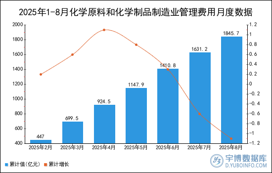 2025年1-8月化學(xué)原料和化學(xué)制品制造業(yè)管理費(fèi)用累計(jì)值為1845.7億元。