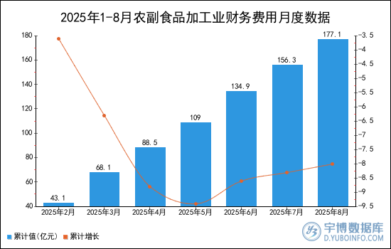2025年1-8月農(nóng)副食品加工業(yè)財(cái)務(wù)費(fèi)用累計(jì)值為177.1億元。