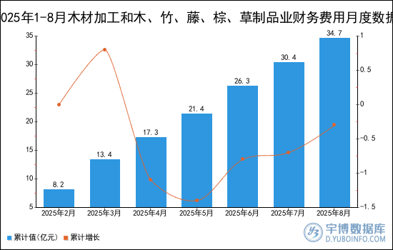 2025年1-8月木材加工和木、竹、藤、棕、草制品業(yè)財務(wù)費用累計值為34.7億元。
