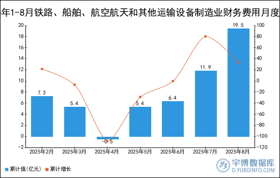 2025年1-8月鐵路、船舶、航空航天和其他運(yùn)輸設(shè)備制造業(yè)財(cái)務(wù)費(fèi)用累計(jì)值為19.5億元,累計(jì)增長33.6%。