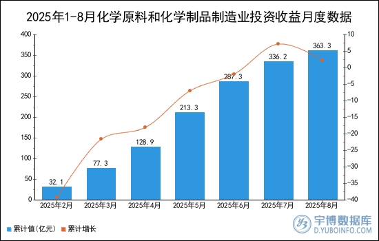 2025年1-8月化學(xué)原料和化學(xué)制品制造業(yè)投資收益累計(jì)值為363.3億元,累計(jì)增長(zhǎng)2.2%。