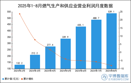 2025年1-8月燃氣生產(chǎn)和供應(yīng)業(yè)營業(yè)利潤累計值為539.1億元。