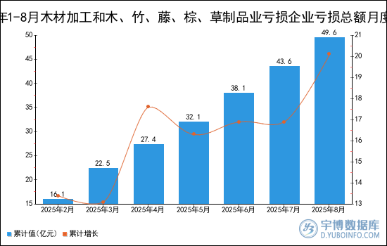 2025年1-8月木材加工和木、竹、藤、棕、草制品業(yè)虧損企業(yè)虧損總額累計(jì)值為49.6億元,累計(jì)增長(zhǎng)20.1%。