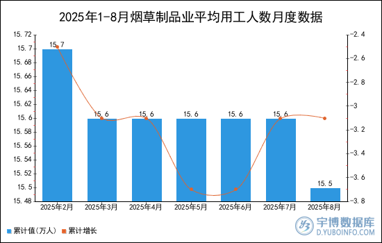 2025年1-8月煙草制品業(yè)平均用工人數(shù)累計(jì)值為15.5萬人。