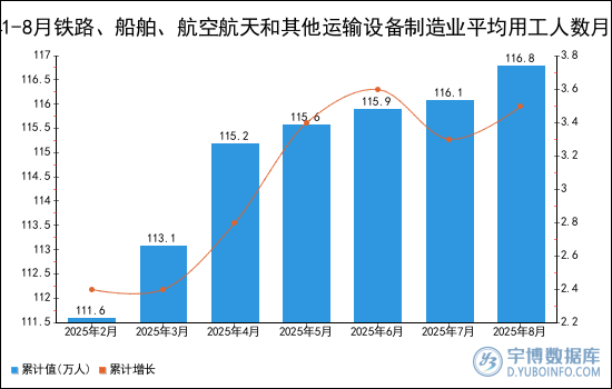 2025年1-8月鐵路、船舶、航空航天和其他運(yùn)輸設(shè)備制造業(yè)平均用工人數(shù)累計(jì)值為116.8萬人,累計(jì)增長3.5%。