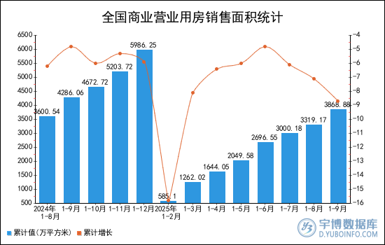 2025年1-9月全國商業(yè)營業(yè)用房銷售面積分月數(shù)據(jù)