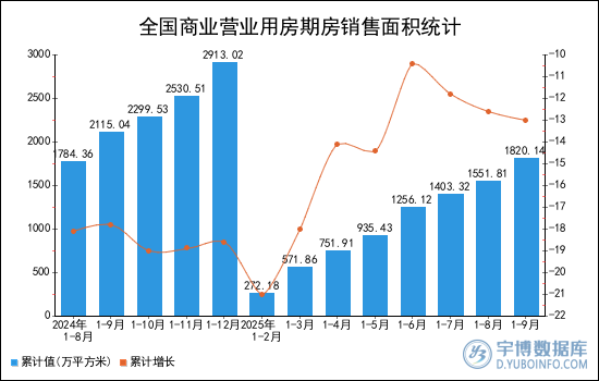 2025年1-9月全國(guó)商業(yè)營(yíng)業(yè)用房期房銷售面積(累計(jì)值)為1820.14萬(wàn)平方米,累計(jì)下降13%。