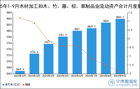 2025年9月木材加工和木、竹、藤、棕、草制品業(yè)流動資產(chǎn)合計本月末為3840.2億元。