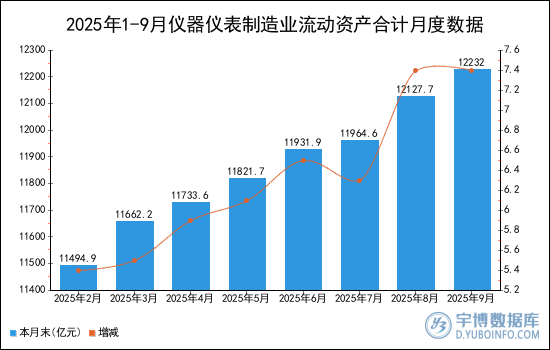 2025年9月儀器儀表制造業(yè)流動(dòng)資產(chǎn)合計(jì)本月末為12232億元,增減7.4%。