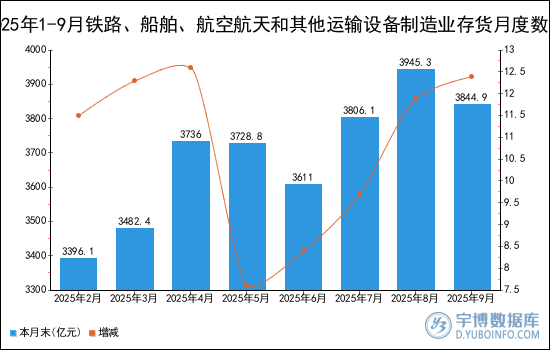 2025年9月鐵路、船舶、航空航天和其他運(yùn)輸設(shè)備制造業(yè)存貨本月末為3844.9億元,增減12.4%。