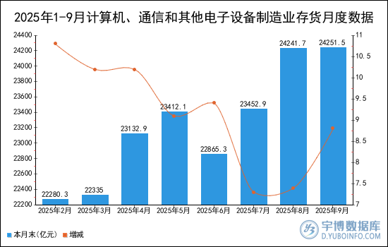 2025年9月計算機、通信和其他電子設(shè)備制造業(yè)存貨本月末為24251.5億元,增減8.8%。