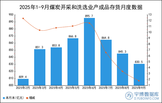 2025年9月煤炭開采和洗選業(yè)產成品存貨本月末為830.5億元,增減1.8%。
