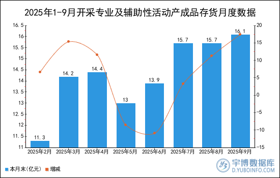 2025年9月開采專業(yè)及輔助性活動產(chǎn)成品存貨本月末為16.1億元,增減17.5%。