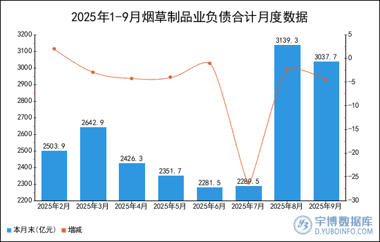 2025年9月煙草制品業(yè)負債合計本月末為3037.7億元。
