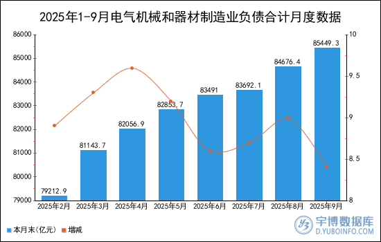2025年9月電氣機械和器材制造業(yè)負債合計本月末為85449.3億元,增減8.4%。