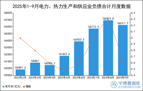 2025年9月電力、熱力生產(chǎn)和供應(yīng)業(yè)負債合計本月末為166311.2億元,增減5.6%。