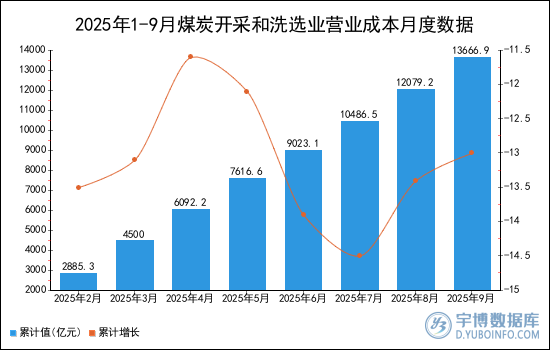 2025年1-9月煤炭開采和洗選業(yè)營業(yè)成本累計值為13666.9億元。