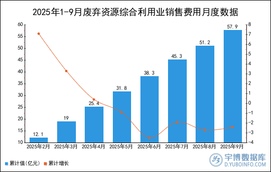 2025年1-9月廢棄資源綜合利用業(yè)銷(xiāo)售費(fèi)用累計(jì)值為57.9億元。