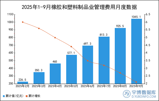 2025年1-9月橡膠和塑料制品業(yè)管理費用累計值為1045.1億元,累計增長2.1%。
