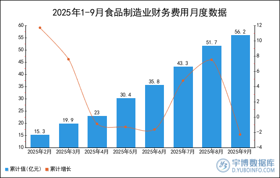 2025年1-9月食品制造業(yè)財務費用累計值為56.2億元。
