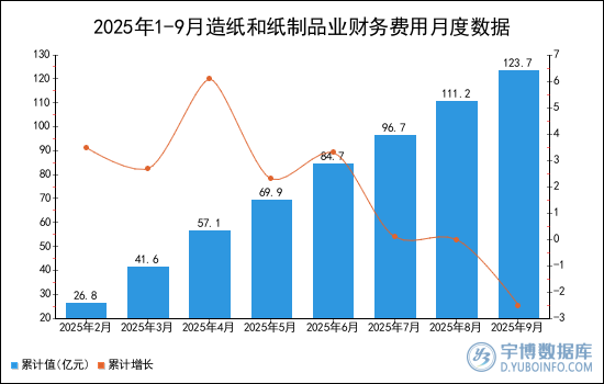 2025年1-9月造紙和紙制品業(yè)財(cái)務(wù)費(fèi)用累計(jì)值為123.7億元。