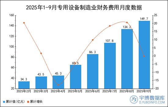 2025年1-9月專用設(shè)備制造業(yè)財(cái)務(wù)費(fèi)用累計(jì)值為149.7億元。