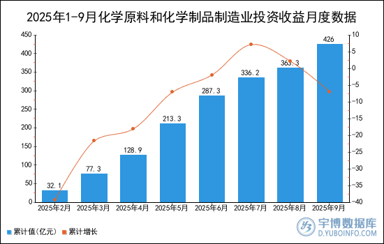 2025年1-9月化學(xué)原料和化學(xué)制品制造業(yè)投資收益累計值為426億元。