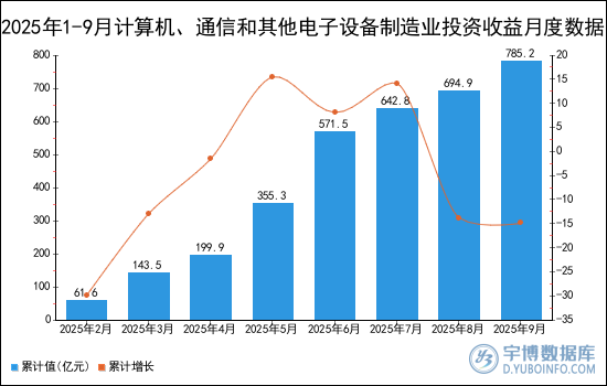 2025年1-9月計(jì)算機(jī)、通信和其他電子設(shè)備制造業(yè)投資收益累計(jì)值為785.2億元。