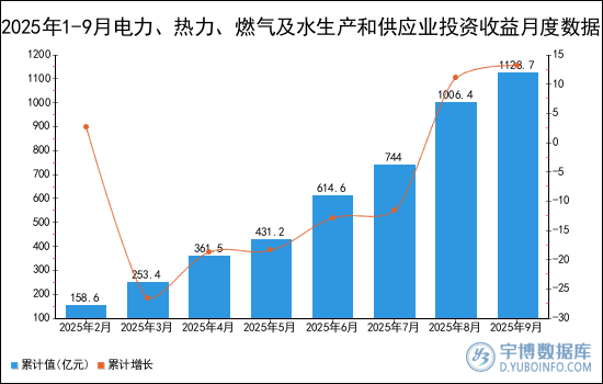 2025年1-9月電力、熱力、燃?xì)饧八a(chǎn)和供應(yīng)業(yè)投資收益累計(jì)值為1128.7億元,累計(jì)增長(zhǎng)13.3%。