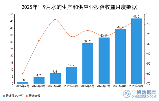 2025年1-9月水的生產和供應業(yè)投資收益累計值為47.2億元。