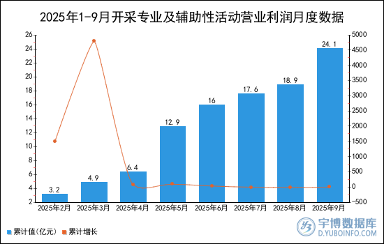 2025年1-9月開(kāi)采專業(yè)及輔助性活動(dòng)營(yíng)業(yè)利潤(rùn)累計(jì)值為24.1億元,累計(jì)增長(zhǎng)4.8%。