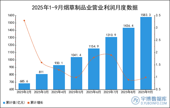 2025年1-9月煙草制品業(yè)營業(yè)利潤累計(jì)值為1583.3億元,累計(jì)增長1%。