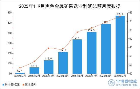 2025年1-9月黑色金屬礦采選業(yè)利潤總額累計值為335.4億元。