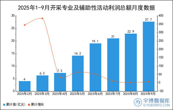 2025年1-9月開采專業(yè)及輔助性活動利潤總額累計值為27.7億元,累計增長7.4%。