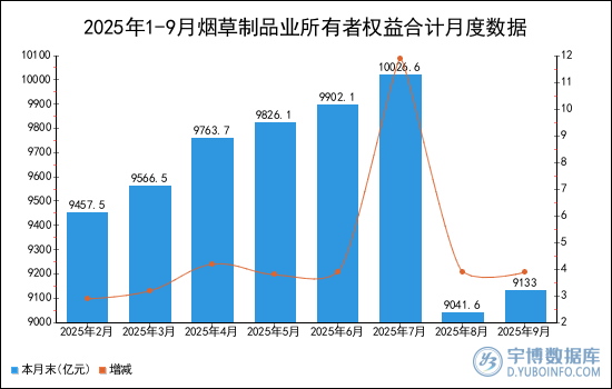 2025年9月煙草制品業(yè)所有者權(quán)益合計(jì)本月末為9133億元,增減3.9%。