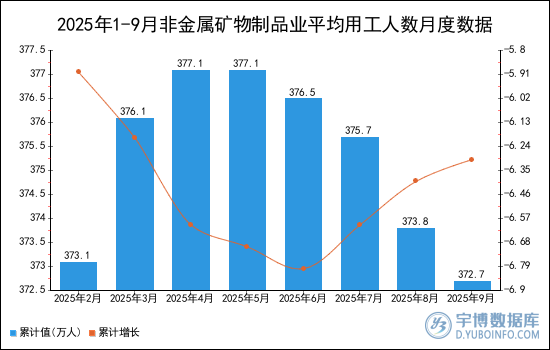 2025年1-9月非金屬礦物制品業(yè)平均用工人數(shù)累計(jì)值為372.7萬(wàn)人。