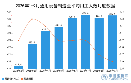 2025年1-9月通用設(shè)備制造業(yè)平均用工人數(shù)累計值為426.5萬人,累計增長0.6%。