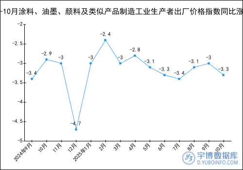 2025年10月涂料、油墨、顏料及類似產(chǎn)品制造工業(yè)生產(chǎn)者出廠價格指數(shù)為96.7,同比下降3.3%。
