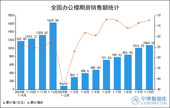 2025年1-10月全國辦公樓期房銷售額(累計值)為1084.52億元,累計下降12.3%。