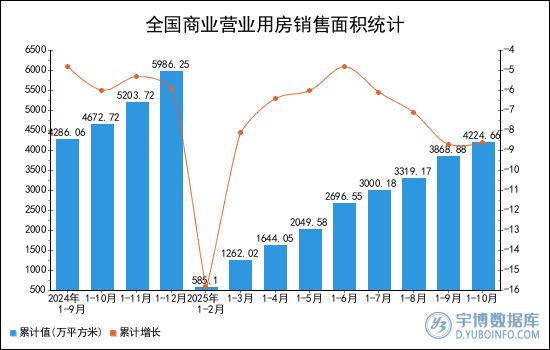 2025年1-10月全國商業(yè)營業(yè)用房銷售面積(累計(jì)值)為4224.66萬平方米,累計(jì)下降8.6%。
