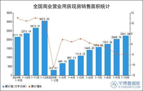 2025年1-10月全國(guó)商業(yè)營(yíng)業(yè)用房現(xiàn)房銷售面積(累計(jì)值)為2241.04萬(wàn)平方米,累計(jì)下降4.6%。