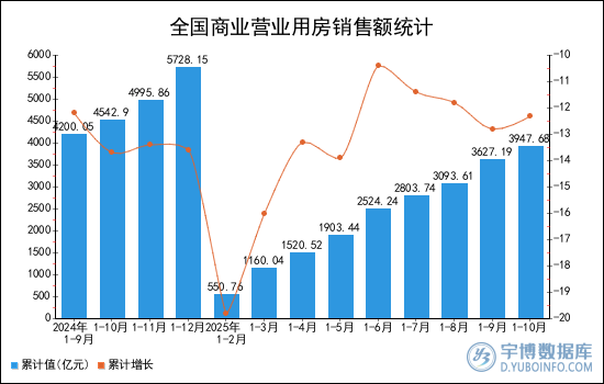 2025年1-10月全國商業(yè)營業(yè)用房銷售額(累計值)為3947.68億元,累計下降12.3%。