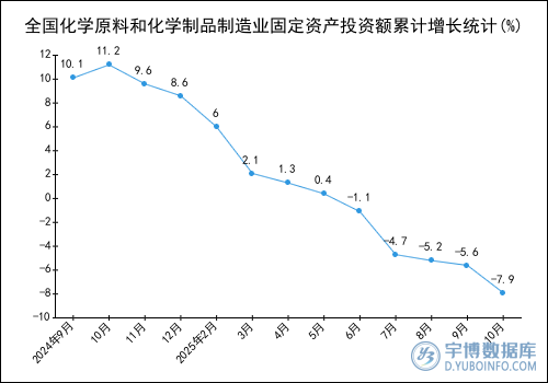 2025年1-10月全國化學原料和化學制品制造業(yè)固定資產(chǎn)投資額(累計增長)為-7.9%