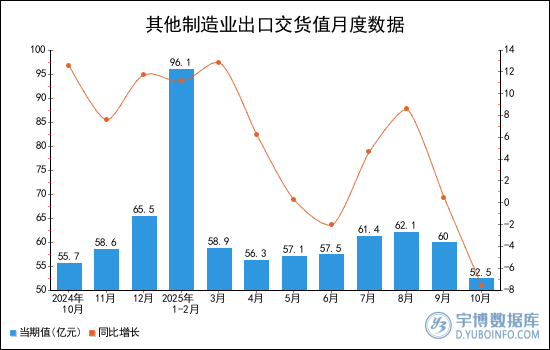 【中國報告大廳訊】根據(jù)中國報告大廳對2025年1-10月全國其他制造業(yè)出口交貨值進行監(jiān)測統(tǒng)計顯示:2025年10月全國其他制造業(yè)出口交貨值52.5億元,同比下降7.6%,2025年1-10月全國其他制造業(yè)出口交貨值為549.1億元,累計增長0.8%。