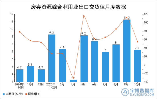 2025年10月全國(guó)廢棄資源綜合利用業(yè)出口交貨值為7.3億元,累計(jì)值為74億元,同比增長(zhǎng)55%,累計(jì)增長(zhǎng)53.7%。