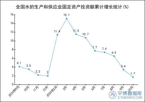 2025年1-10月全國水的生產(chǎn)和供應(yīng)業(yè)固定資產(chǎn)投資額(累計增長)為1.7%